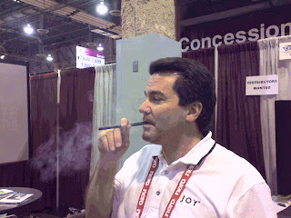 This man is not smoking. He is using an electronic oral nicotine delivery device. The smoke is actually water vapor. He says he uses it on air plans and in places that ban smoking. He gets his drug, and oral fixation, and the public gets none of the smell and danger. He also is getting less of the bad stuff.